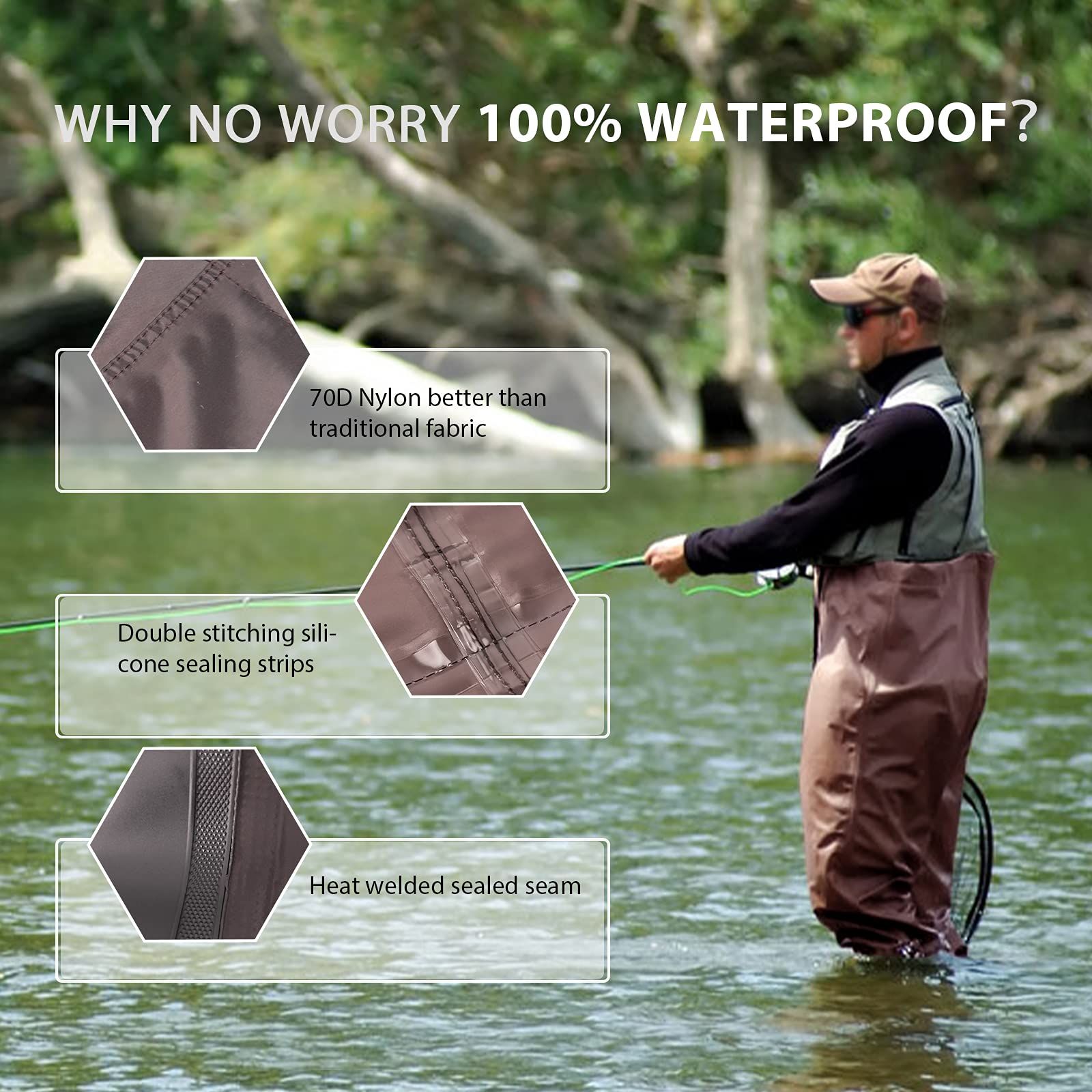 2.LIGHTWEIGHT - New 70D nylon and PVC material weighs 35% lighter than traditional rubber waders, more flexible in water and less energy spent, allows you to wear warmer clothes and hike in the river more comfortably.