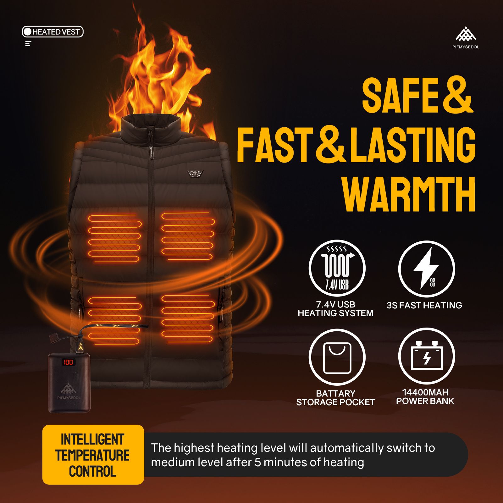 3.Vest Comes with 14400mAh Battery. This heating vest's battery has UL/FCC certification, ensuring safety. Feel the warmth in seconds with the 7.4V heating system. The battery for the heating vest can last up to 7-8 hours in low heating, 5-6 hours in medium heating, and 3-4 hours in high heating on a single charge. Quick Charge 3.0 allows for a full recharge of the battery in 5 hours. USB port for charging smartphones.